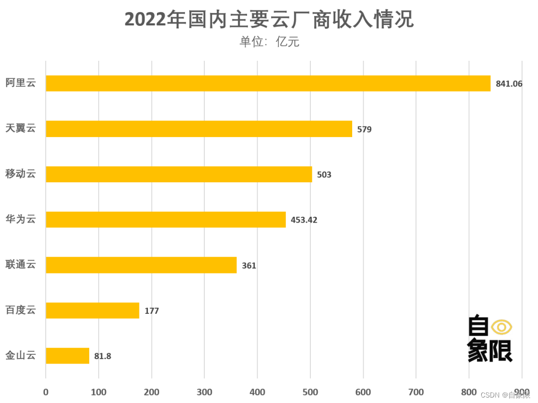 - 2022年,各云厂商营收:阿里云841.06亿元、电信云579亿元、移动云503亿、华为云453.42亿元、联通云361亿、百度云177亿元、金山云:81.8亿元。