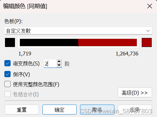 若只想让负数凸显出红色,其他数据保持黑色,编辑颜色选择自定义发散的颜色,并将两端设置为红色和黑色,渐变颜色设定为2