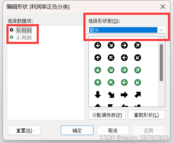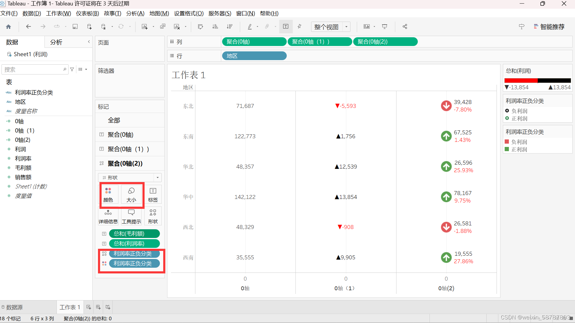 step4 创建【利润率正负分类】计算字段,标记卡选择【形状】,把字段拖入【颜色】和【大小】,【编辑形状】分别为正、负利润选择上、下箭头,最后调节颜色和大小