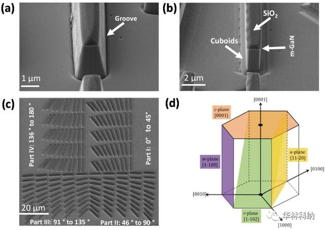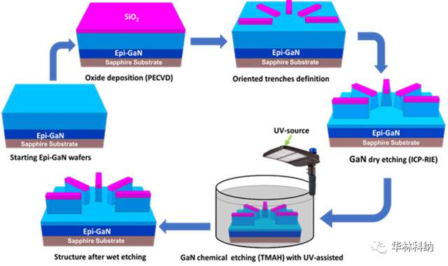 制造过程首先是在晶片上沉积一个1µm厚的二氧化硅(PECVD)层,作为一个掩模,然后用PMMA9%抗蚀剂进行电子束光刻技术,二氧化硅使用CF4/He混合气体的干蚀刻进行蚀刻,将图案从抗蚀剂转移到二氧化硅掩模,最后,使用TMAH溶液进行氮化镓湿式蚀刻。