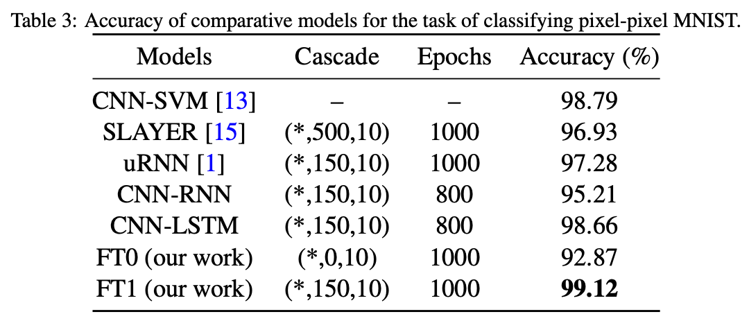 表 3:各模型在 pixel-by-pixel MNIST 任务上的准确率。