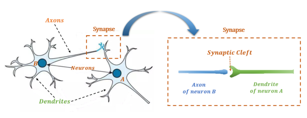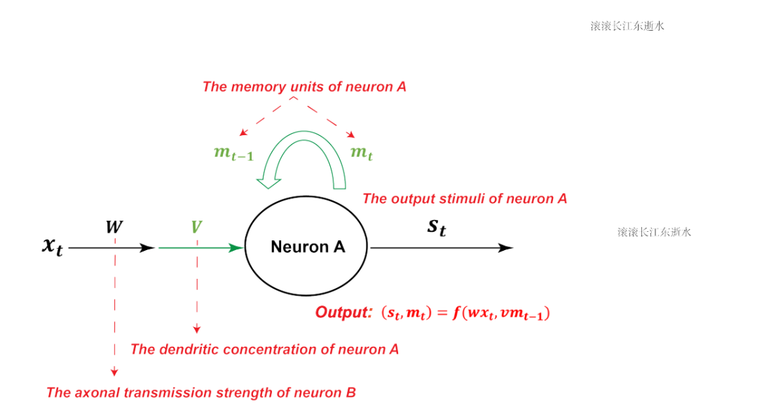 神经科学方面的这一有趣发现表明,神经元 A 接收到来自神经元 B 的刺激信号后的响应不仅取决于神经元 B 的轴突传递强度,还依赖于神经元 A 的树突浓度,而这与神经元 A 的记忆单元有关,如图 2 所示。