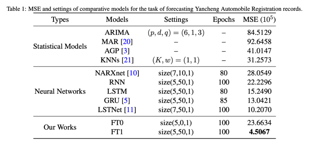 表 1:在盐城汽车上牌量预测任务上的均方差(MSE)和模型设置。