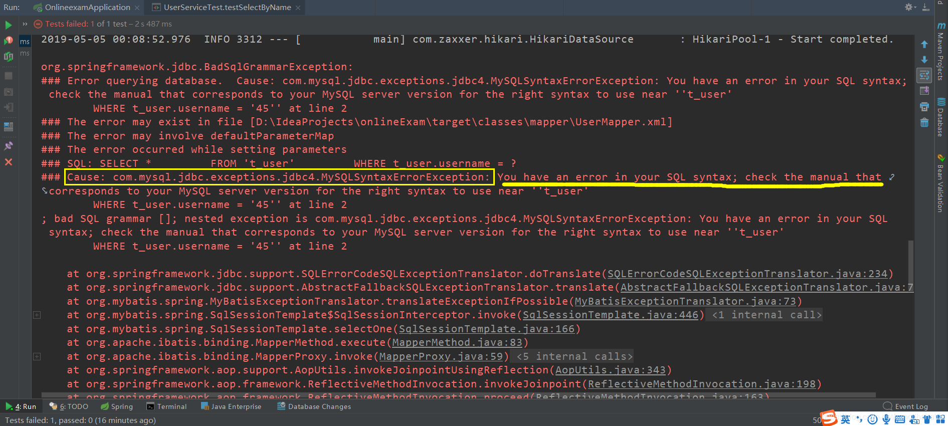 ; bad SQL grammar []; nested exception is com.mysql.jdbc.exceptions.jdbc4.MySQLSyntaxErrorException: You have an error in your SQL syntax; check the manual that corresponds to your MySQL server version for the right syntax to use near ''t_user'WHERE t_user.username = '45'' at line 2