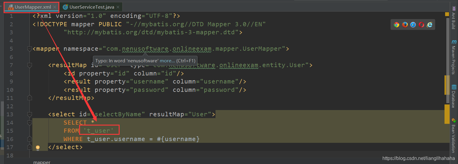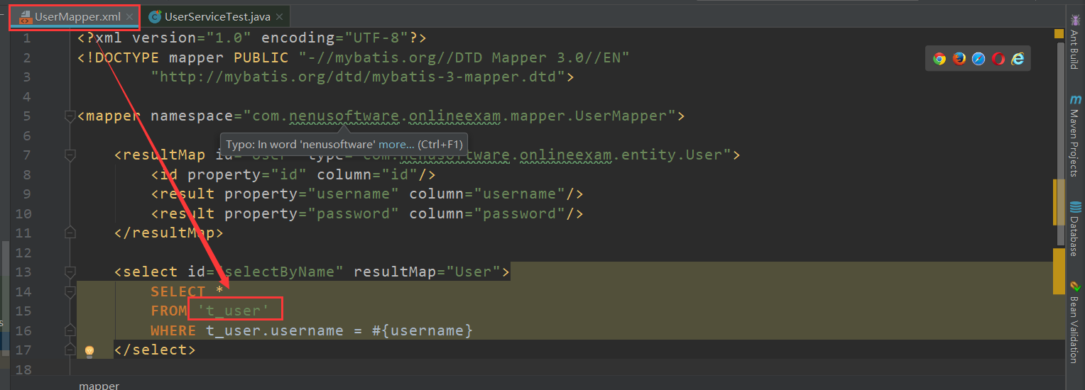 于是去检查相应的查询语句,发现在 UserMapper.xml 中关于查询 t_user 这个表,我多写了一对引号: