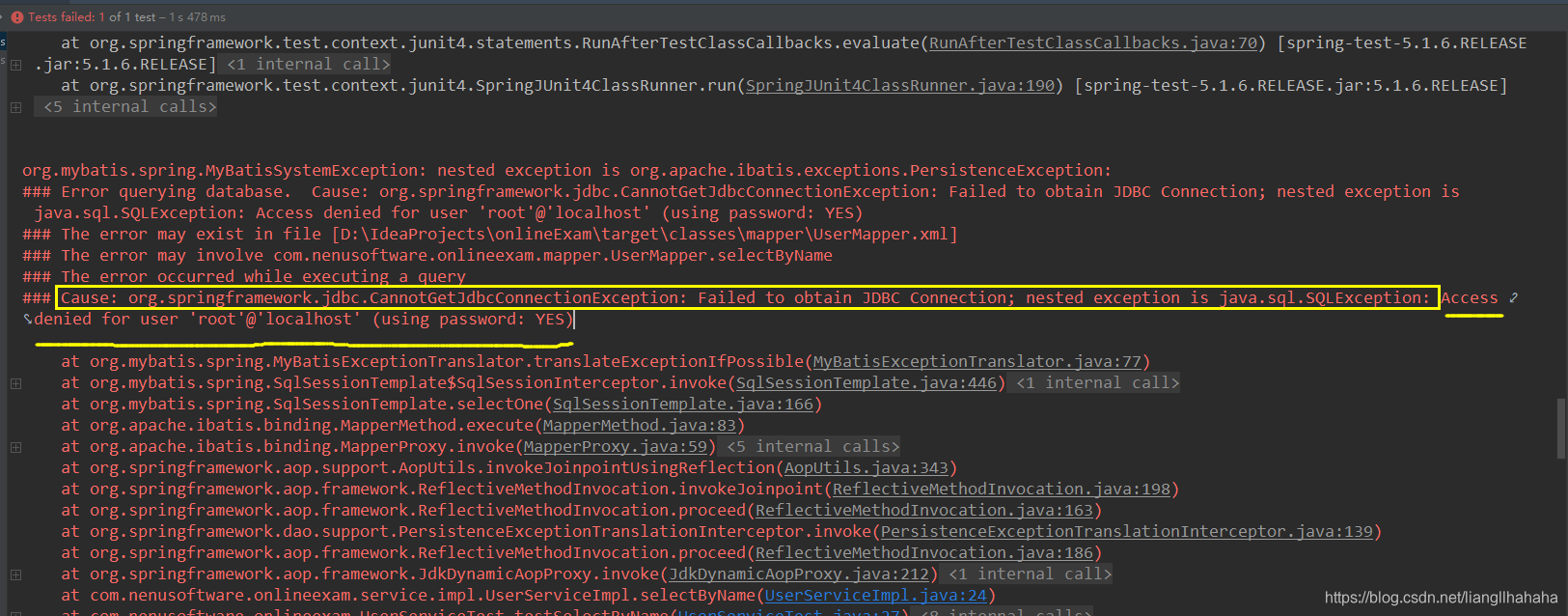 ### Cause: org.springframework.jdbc.CannotGetJdbcConnectionException: Failed to obtain JDBC Connection; nested exception is com.mysql.jdbc.exceptions.jdbc4.MySQLSyntaxErrorException: Access denied for user 'root'@'127.0.0.1' to database 'db_onlineexam'