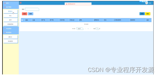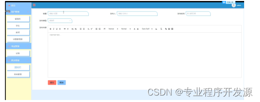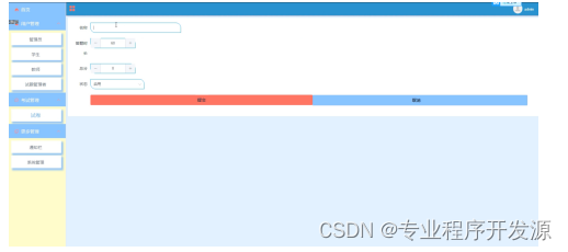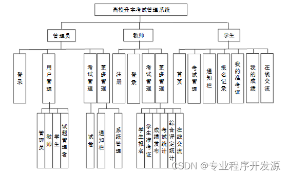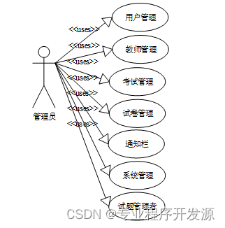 后台系统管理员因职责的不同,分为普通管理员、学生、教师和试题管理者,管理员主要对用户管理、教师,学生,试题管理者、考试管理、试卷管理、通知栏、系统管理。