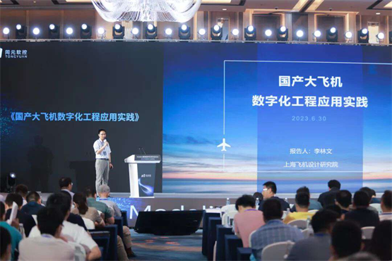 中国商飞上海飞机设计研究院试验规划与总体部部长助理、研究员李林文代表上海飞机设计研究院副院长、型号常务副总师王鸿鑫分享了《国产大飞机数字化工程应用实践》主题报告,阐述了国产大飞机的数字化实践与整体规划。