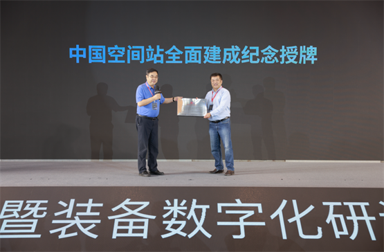 在授牌仪式环节,杨宏院士代表航天科技集团公司第五研究院总体设计部空间站系统项目办,向为空间站建设做出突出贡献的苏州同元软控信息技术有限公司授予“中国空间站全面建成纪念奖牌”。苏州同元软控信息技术有限公司董事长陈立平教授受邀上台,从杨院士手中接过了这块代表着荣誉、创新与汗水的牌匾。