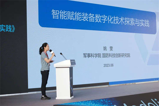 军事科学院国防科技创新研究院研究员姚雯首先分享了《智能赋能装备数字化技术探索实践》主题报告,介绍了飞行器智能优化设计,飞行器混合数字孪生构建与应用等技术研究与实践。