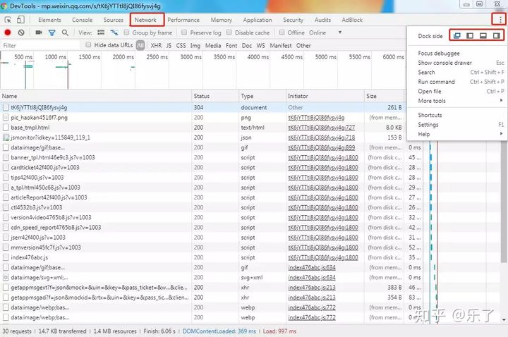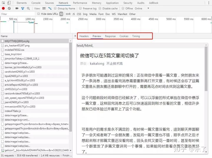 再回到开发者工具窗口,点"Network"标签,按F5刷新网页(一定要先打开开发者工具再加载网页它才能监测到数据的加载),会看到下面飞快得列出许多内容。不知道是些啥玩意?其实这是一个网页要正常显示需要下载的所有文件(比如图片,css样式表,js脚本等),一个看似简单的网页背后可能是由许多文件组成的(当然也可以只有一个文件),而我们要保存文章正是要把每一行所列出来的文件都保存下来。