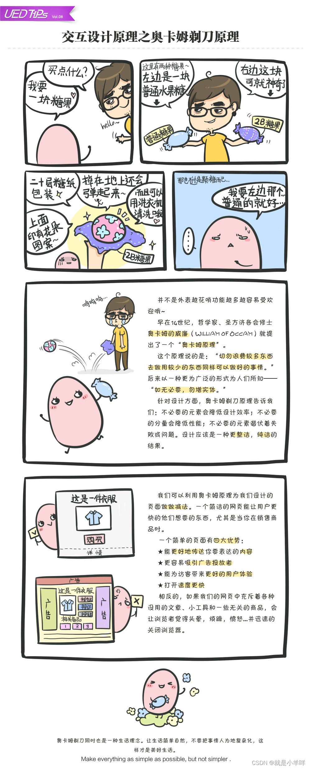 注:奥卡姆剃刀原理并不是只肯定简单的设计就是好的,也不是否定一切复杂含蓄的设计就是不好的。其核心是:“简单”设计,强调党两个设计方案都能达到设计目的的时候,选择较为简单的那个。因为“简单”设计比“复杂”设计更容易让人理解,传达效果更好,可以以小博大。