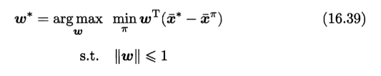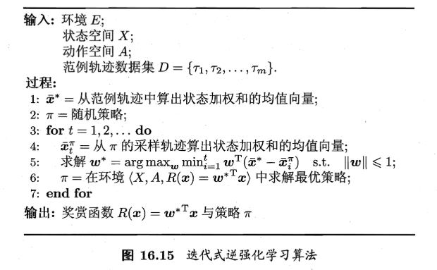 一个较好的办法是从随机策略开始,迭代地求解更好的奖赏函数,基于奖赏函数获得更好的策略,直至最终获得最符合范例轨迹数据集的奖赏函数和策略如下图。注意在求解更好的奖赏函数时,需将式(16.39)中对所有策略求最小改为对之前学得的策略求最小.