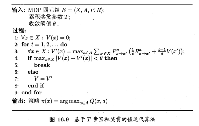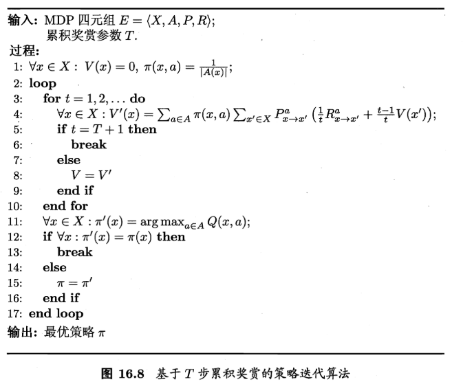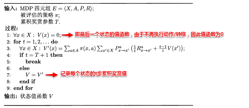 易知:当模型已知时,策略的评估问题转化为一种动态规划问题,即以填表格的形式自底向上,先求解每个状态的单步累积奖赏,再求解每个状态的两步累积奖赏,一直迭代逐步求解出每个状态的T步累积奖赏。算法流程如下所示: