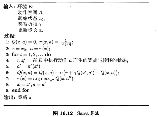 该算法由于每次更新值函数需知道前一步的状态(state)、前一步的动作(action)、奖赏值(reward)、当前状态(state)、将要执行的动作(action),由此得名为 Sarsa 算法。显然是同策略算法,算法中评估(第 6 行)、执行(第 5 行)的均为