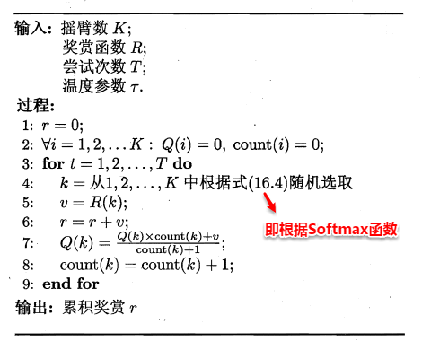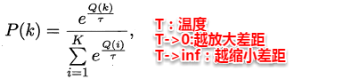 Softmax算法则基于当前每个动作的平均奖赏值来对探索和利用进行折中,Softmax函数将一组值转化为一组概率,值越大对应的概率也越高,因此当前平均奖赏值越高的动作被选中的几率也越大。Softmax函数如下所示: