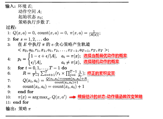 在上面的算法流程中,被评估和被改进的都是同一个策略,因此称为同策略蒙特卡罗强化学习算法。引入ε-贪心仅是为了便于采样评估,而在使用策略时并不需要ε-贪心,那能否仅在评估时使用ε-贪心策略,而在改进时使用原始策略呢?这便是异策略蒙特卡罗强化学习算法。