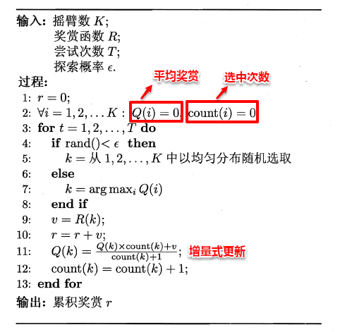 ε-贪心法基于一个概率来对探索和利用进行折中,具体而言:在每次尝试时,以ε的概率进行探索,即以均匀概率随机选择一个动作;以1-ε的概率进行利用,即选择当前最优的动作。ε-贪心法只需记录每个动作的当前平均奖赏值与被选中的次数,便可以增量式更新。