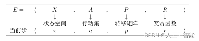 其中,转移矩阵 P : X × A × X ↦ R P:X\times A\times X\mapsto \mathbb{R} P:X×A×X↦R,奖赏函数 R : X × A × X ↦ R R:X\times A\times X\mapsto \mathbb{R} R:X×A×X↦R或 R : X × X ↦ R R:X\times X\mapsto \mathbb{R} R:X×X↦R