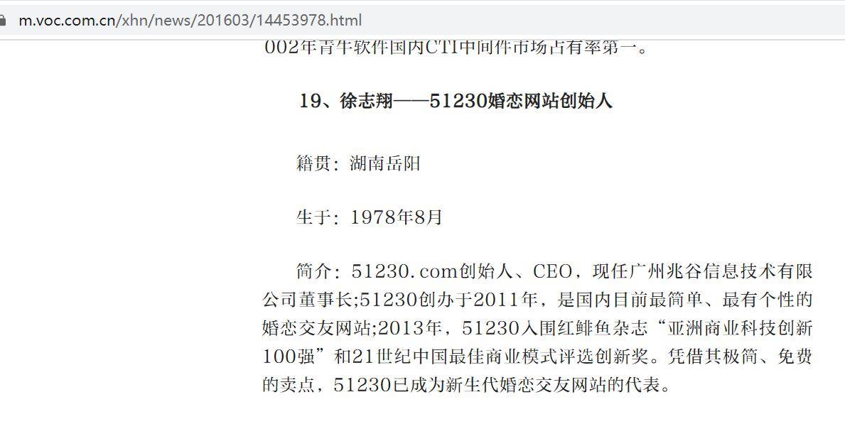 既然名列湖南籍互联网知名人士,可见当时徐志翔已经崭露头角,但51230的创业最终并不算成功,据说曾被三大婚恋网站之一要约收购,结果不知什么原因没谈成, 也有可能是徐志翔其实不差钱吧;