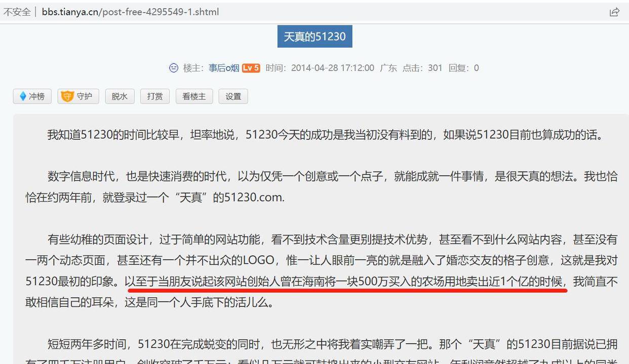 还好功夫不负有心人,就在我胡乱搜索关键字“51230,创始人,海南”时,居然查到一篇2014年4月天涯论坛的帖子,算是找到了一条重要线索,总算有知情人间接证实徐志翔 “曾在海南将一块500万买入的农场用地卖出近1个亿”;