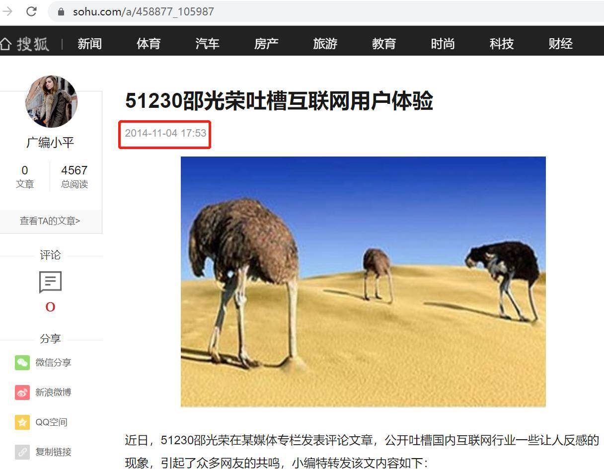 有一条搜索结果引起了我的注意,这是2014年11月发布在搜狐的一篇文章:51230邵光荣吐槽互联网用户体验;