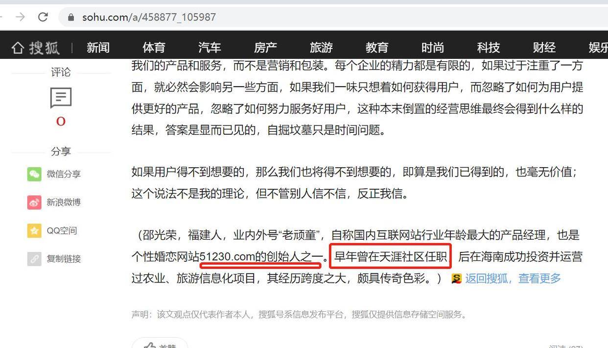 重要的信息是这篇文章底部对邵光荣的简介:个性婚恋网站51230.com的创始人之一。早年曾在天涯社区任职,后在海南成功投资并运营过农业、旅游信息化项目。