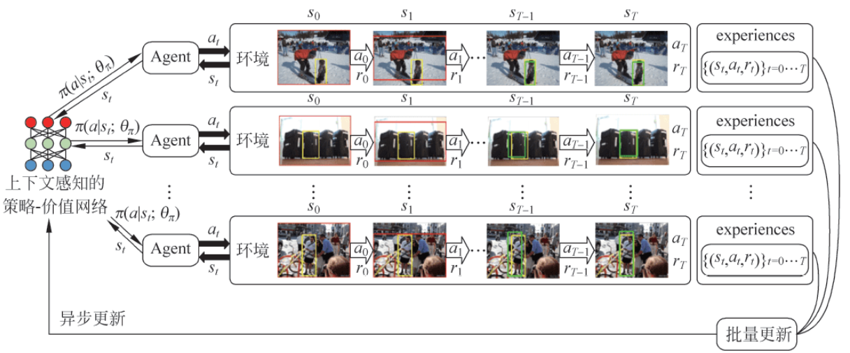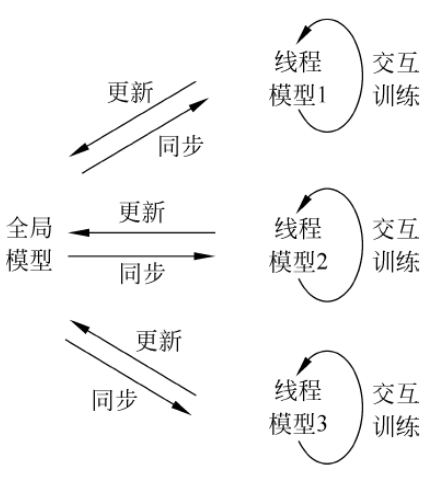 异步方法的核心思想:并行的交互采样和训练。在异步方法中,同时启动多个线程,智能体将在多个线程中同时进行环境交互。只要保证每一个线程中的环境设定不同,线程间交互得到的转换序列就不会完全一样。样本收集完成以后,每一个线程将独立完成训练并得到参数更新量,并以异步的方式更新到全局的模型参数中。下一次训练时,线程的模型参数将和全局参数完成同步,再使用新的参数进行新一轮的训练。