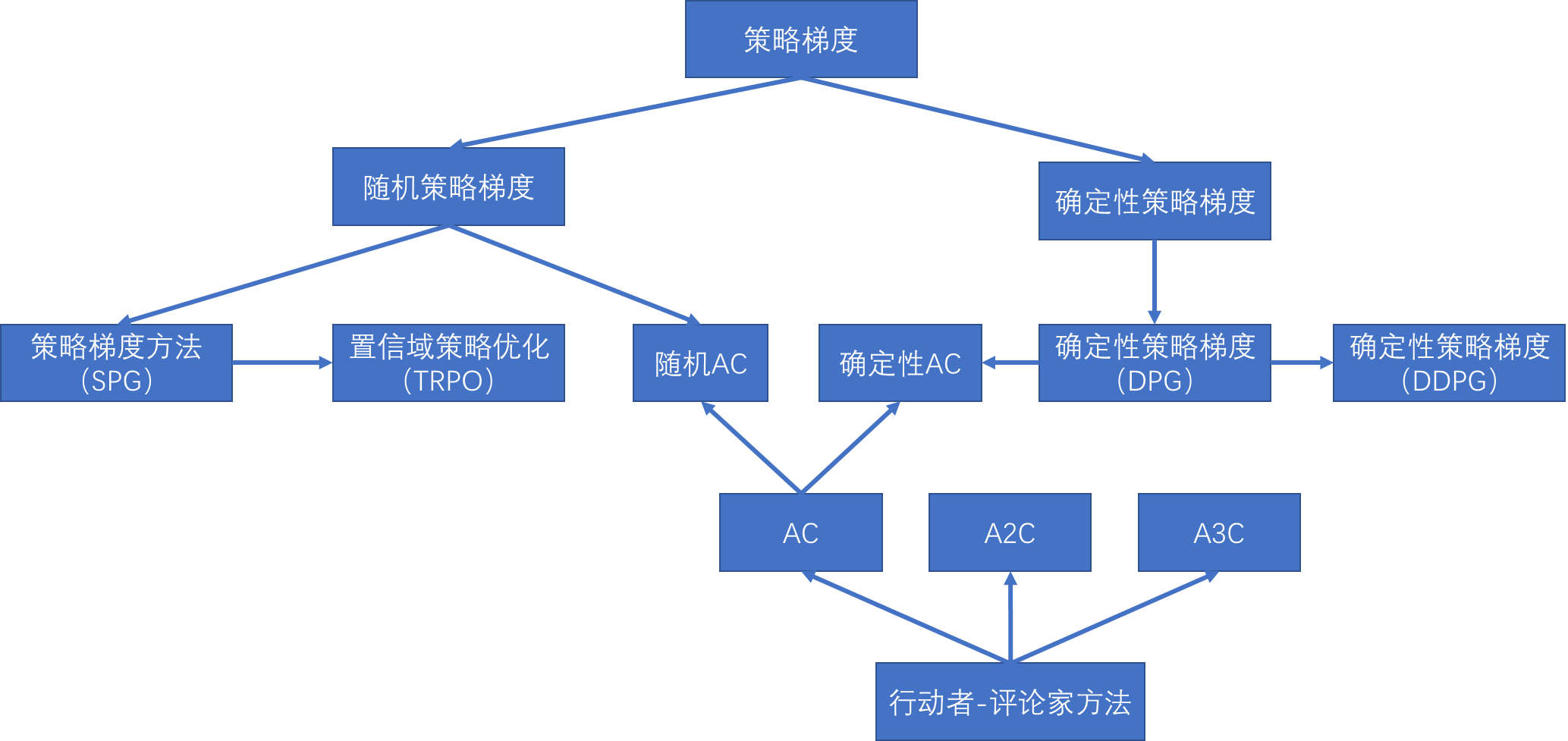 根据策略是随机策略还是确定性策略,分为策略梯度方法(SPG,用PG表示)和确定性策略梯度方法(DPG)。因为,随机策略梯度方法(SPG)存在学习率难以确定的问题,就有了置信域策略优化(TRPO),它能够确定一个使得回报函数单调不减的最优步长。确定性策略梯度方法(DPG)使用的是线性函数逼近行为值函数和确定性策略,如果将线性函数扩展到非线性函数——深度神经网络,就有了深度确定性策略梯度方法(DDPG)。