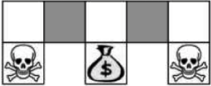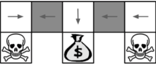 例如,智能体需要在下面的场景中找到钱袋子:5个格子组成5个状态,如果用格子的东南西北4个方向是否有墙壁阻挡这个特征来描述格子状态的话,也就是用这个格子世界状态空间的特征时,就会发生灰色格子状态无法区分的情况(状态重名)。