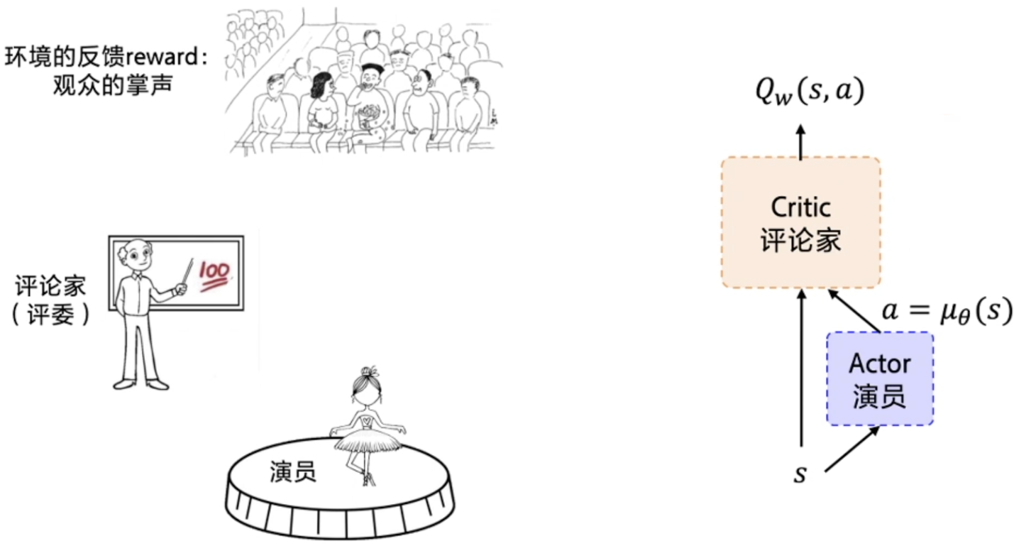 - 行动者-评论家(AC)框架,评论家用来对行为值函数参数进行更新,行动者根据更新后的行为值函数对策略函数参数进行更新。根据采用的策略不同,可分为随机行动者-评论家方法和确定性行动者-评论家方法。
