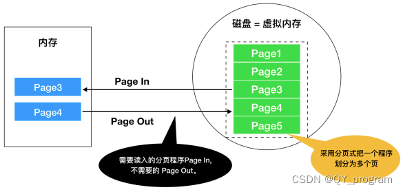 windows采用的是分页式。该方式是指在不考虑程序构造饿情况下,把运行的程序按照一定大小的页进行分割,并以页为单位进行置换。在分页式中,我们把磁盘的内容读到内存中称为page in,把内存的内容写入磁盘称为page out。windows计算机的页大小为4KB,也就是说,需要把应用程序按照4KB的页来进行切分,以页page为单位放到磁盘中,然后进行置换。