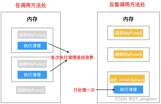 代码中,从main主函数调用到MyFunc()方法,按照默认的设定,栈清理处理会附加在main主函数这一方。在同一个程序中,有可能会多次调用,导致MyFunc()会多次清理,这就会造成内存的浪费。