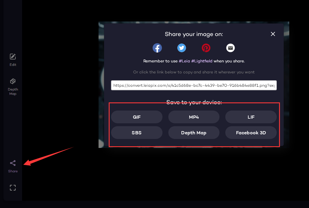 编辑完成后点击“分享”按钮,即可将此3D运动图像导出为gif、MP4、lif、sbs、深度图、Facebook 3D等格式!