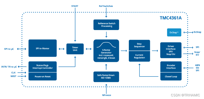 TMC4361是一颗闭环算法芯片,s型坡道和SixPointM坡道运动控制器,运动更平滑,针对步进电机进行了高速优化,同时运动允许动态变化,加减速等。TMC4361A提供SPI和Step/Dir接口,以及用于闭环操作的编码器接口。