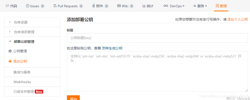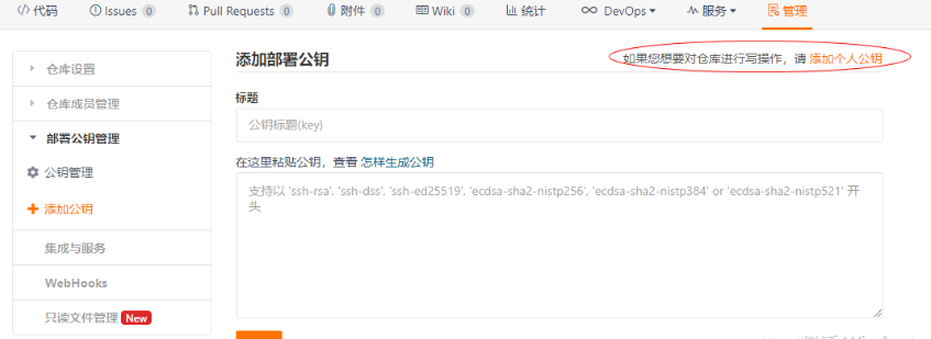 在这里添加之前要把之前的那个只读权限的公钥删除,或者走下面创建多个git用户