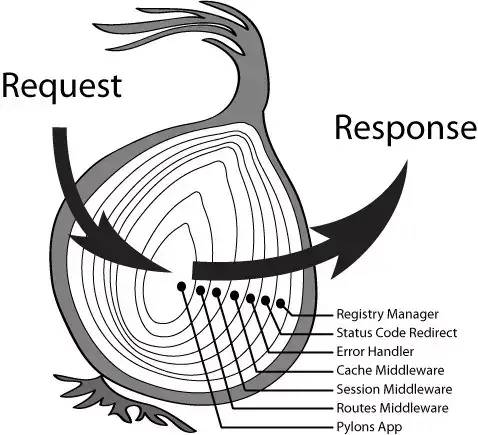 上面是在网上找的一个示意图,就是说中间件执行就像洋葱一样,最早 use 的中间件,就放在最外层。处理顺序从左到右,左边接收一个 request,右边输出返回 response