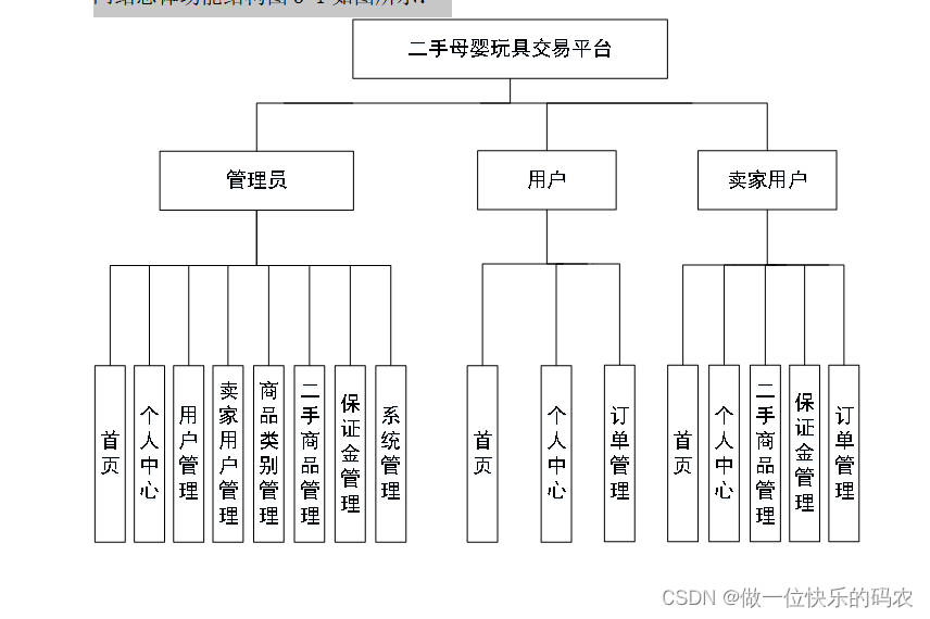 整个二手母婴玩具交易平台为了便于用户购买与卖家用户发货,管理员管理,采用了以下几大功能管理模块,包括管理员与用户、卖家用户的设计: