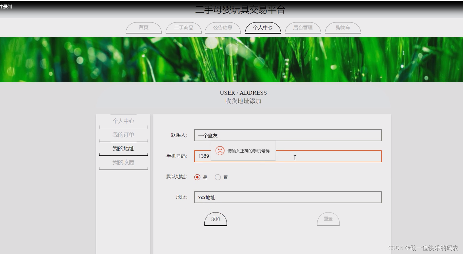 普通用户只能做一些简单的操作,看看首页的二手商品,以及公告信息,当你成为用户后,进行注册、登录,用户账号、密码都正确的时候就可以成功登录,此时进的页面,可以修改个人信息,对商品进行购买,以及可以看到自己的个人中心、订单管理等。