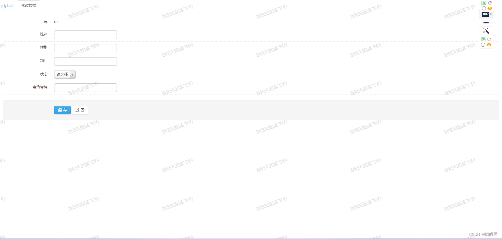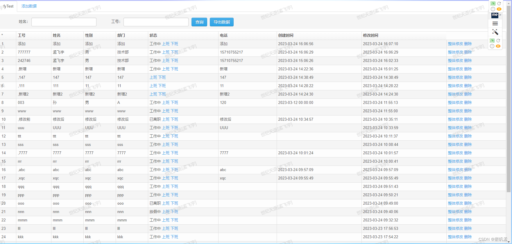 * 工号 姓名 性别 部门 状态 电话 创建时间 修改时间 ${status.index + 1} ${fyTestUser.tuid} ${fyTestUser.name} ${fyTestUser.sex} ${fyTestUser.departments} 工作中 放假中 已离职 上班 下班 ${fyTestUser.telephone} 整体修改 删除