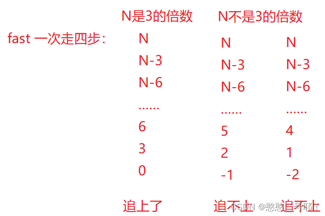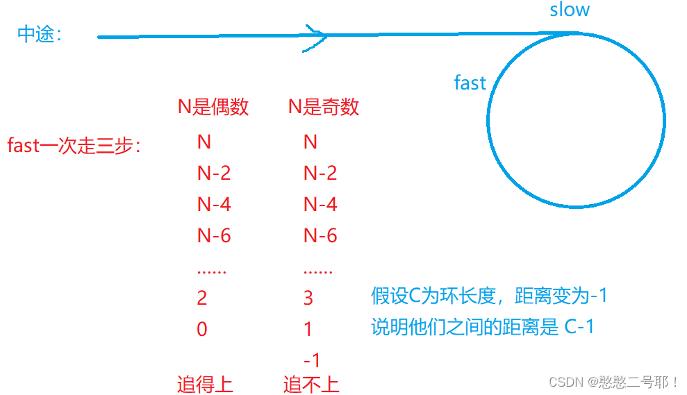 2.如果链表带环,fast 指针依次走三步,四步……n步,slow一次走一步,不一定能追上。