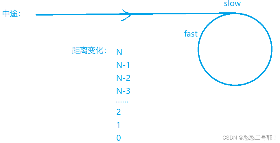 当再走几次之后,当 slow 第一次入环的时候,此时 fast 已经走了一段距离,但是具体有多少,需要根据环的大小来决定。此时我们假设俩个指针之间的距离是 N。
