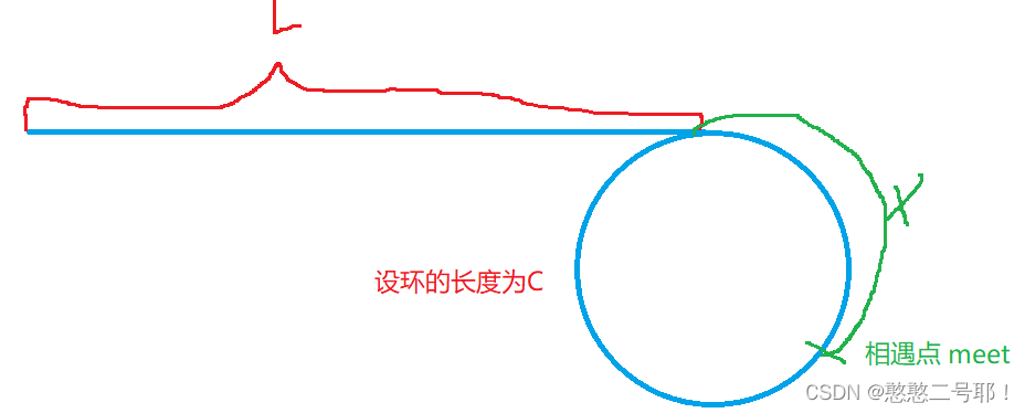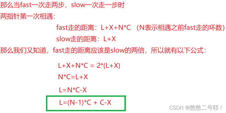 我们将入环之前的那一段记为 L,然后将两个指针的第一次相遇的地方记为 meet ,然后从入环节点到该相遇点之前的这一段距离记为 X,然后将环的长度记为 C。那么我们就可以得到: