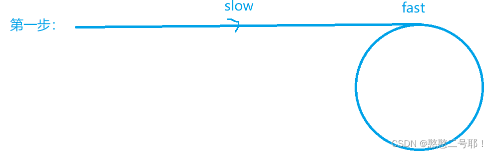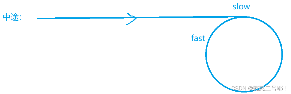那么我们看到,一开始的时候,两个指针都是指向链表头节点的,然后这时候,fast 走两步同时slow走一步,当快指针 fast 一次走两步的时候,fast 指针一定是先入环,此时,slow 才走了入环之前一般的距离。