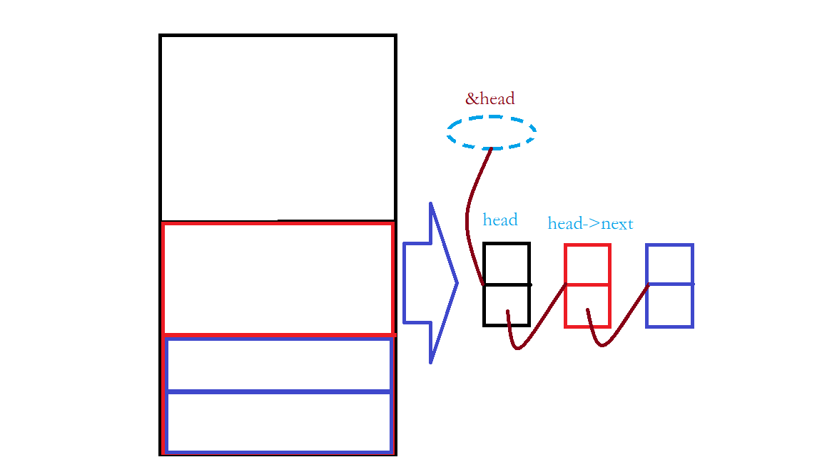 因为这篇文章主题不是介绍链表,所以就不啰嗦了。黑色、红色、蓝色方框分别表示三个不同节点,每个方框(节点)存在上一个节点的下部分,也就是址域。黑色是最外面的那个,也就是head,因为他没有存在包含在其他的方框里面,世界上找不到他,所以head要初始化,而其他的可以通过上一个节点找到就不要初始化。所以链表介绍有头就有链表。