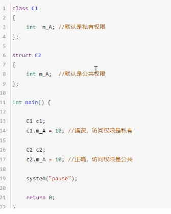 struct与class的唯一区别是默认情况下,struct是公共权限,class是私有权限。