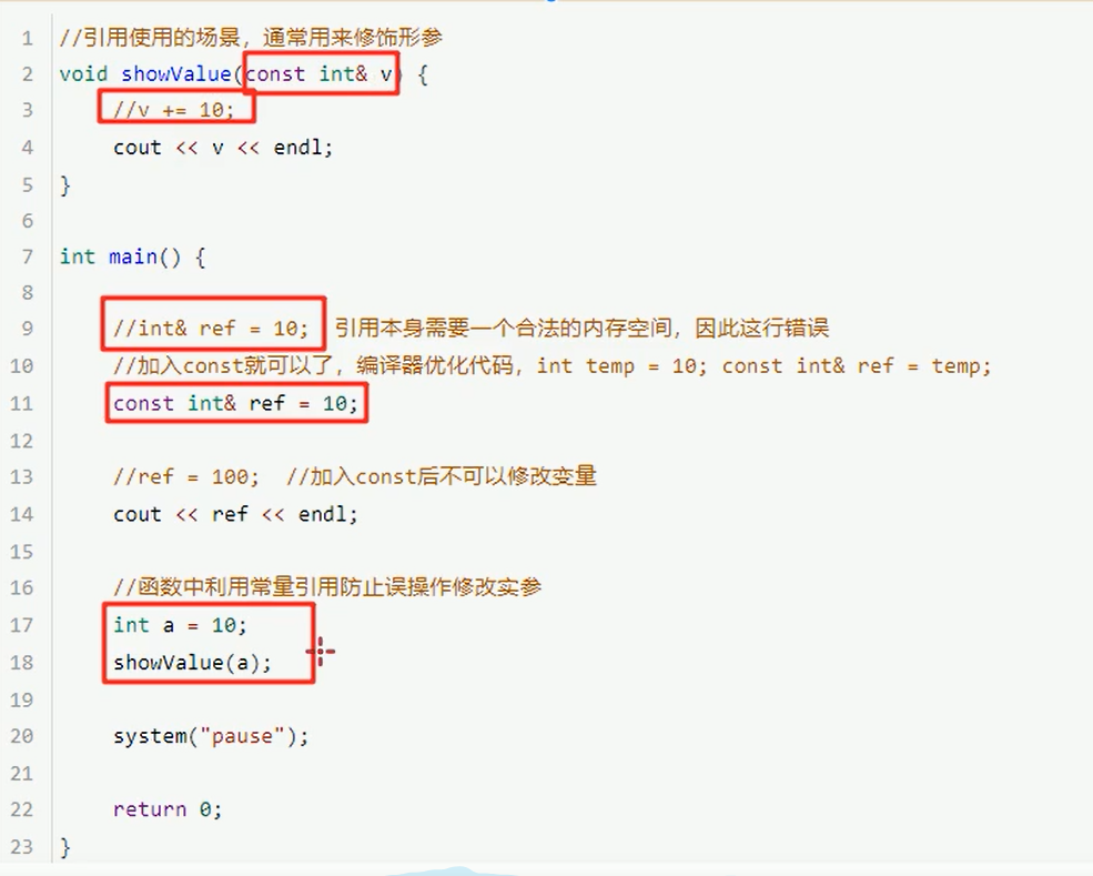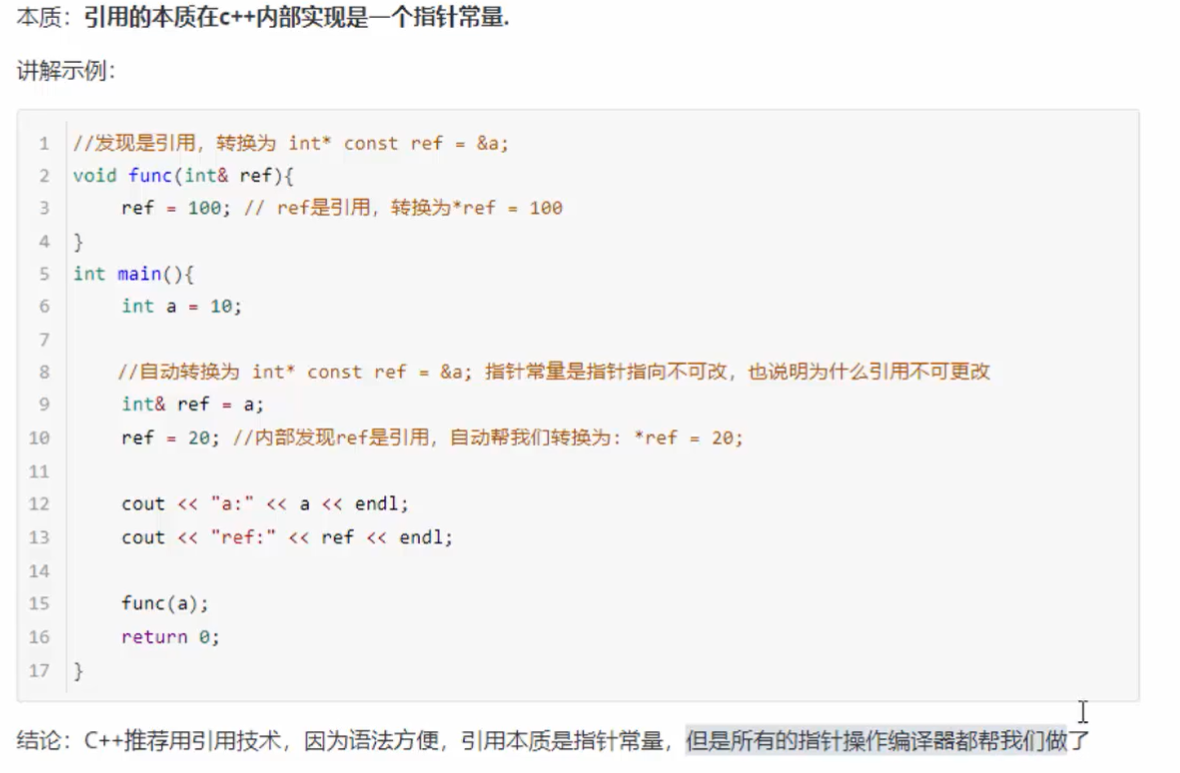 {int a = 10;//a指向的内存值为10int& b = a;//引用的定义,b与a指向同一个内存;cout << &a << "&b: " << &b << endl;int c = 20;//c指向的内存值为20;b = c;//c指向的内存值赋值给b指向的内存值;cout << " a:" << a << " b: " << b << " C: " << c << endl;//引用注意事项://1,引用必须初始化;2,引用一旦初始化就不能改变;system("pause");return 0;