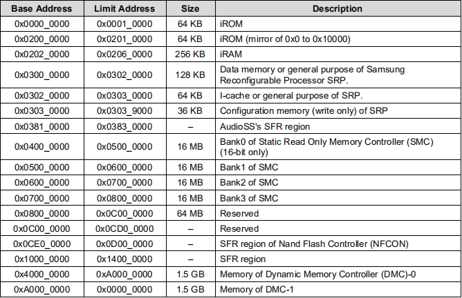 下面是4412地址空间的整体的概览,具体每个地址范围内是什么含义,可以自己去看芯片手册