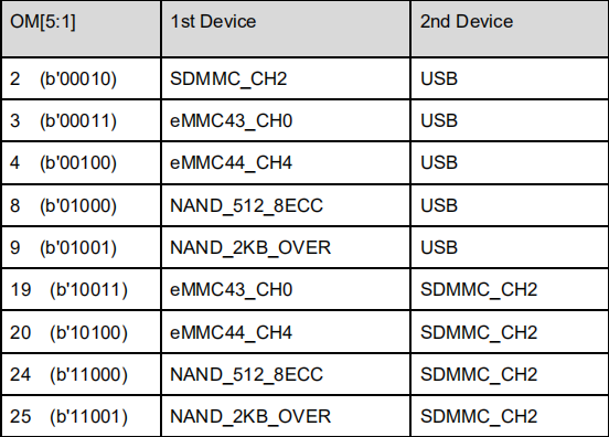 iROM中的程序首先做一些芯片的初始化工作,然后根据OM引脚的状态(由拨码开关控制)来选择引导介质,从图中我们可以看到有NAND、SD卡、eMMC,OM引脚配置与启动介质的对应关系如下图所示,这些启动介质里存储了u-boot镜像。
