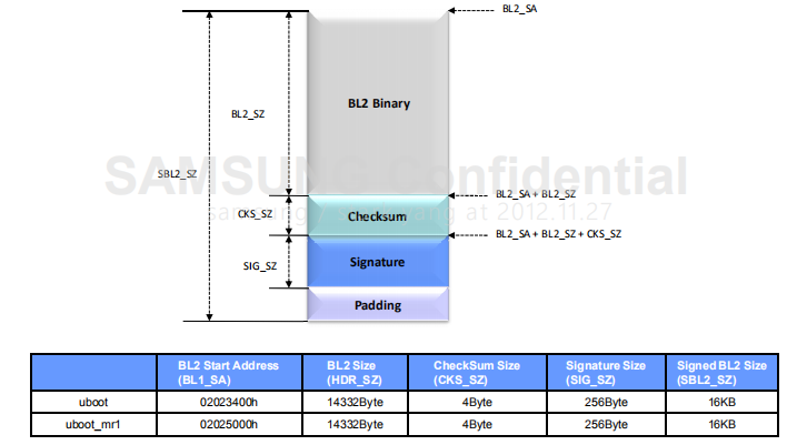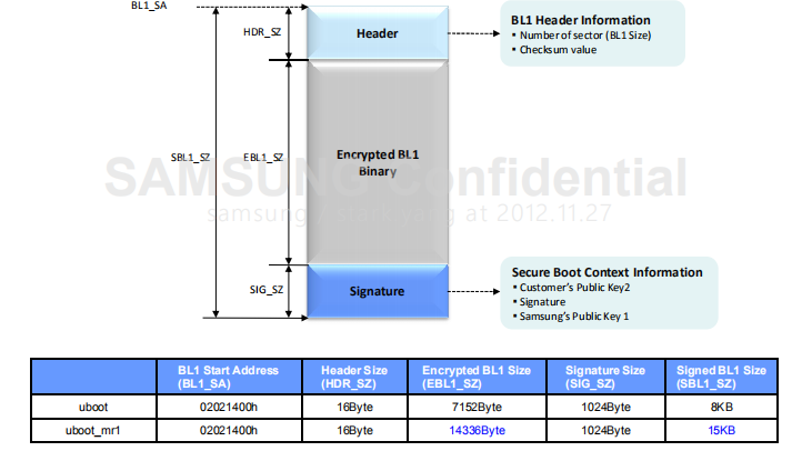 BL1是芯片相关的部分,BL2是平台相关的部分,BL1是三星提供的二进制程序,BL2是使用者自己写得平台相关的程序,使用者需要向芯片供应商提供他们公钥(由CodeSigner Client产生,同时还会产生一个私钥,由使用者保存),芯片供应商会使用CodeSigner Server为使用者提供的公钥产生secure context data,然后把secure context data 封装在BL1二进制文件中,并把这个带有公钥相关的信息的BL1提供给使用者,使用者会将这个带有公钥的BL1和他们自己的带有私钥的BL2结合在一起。